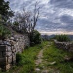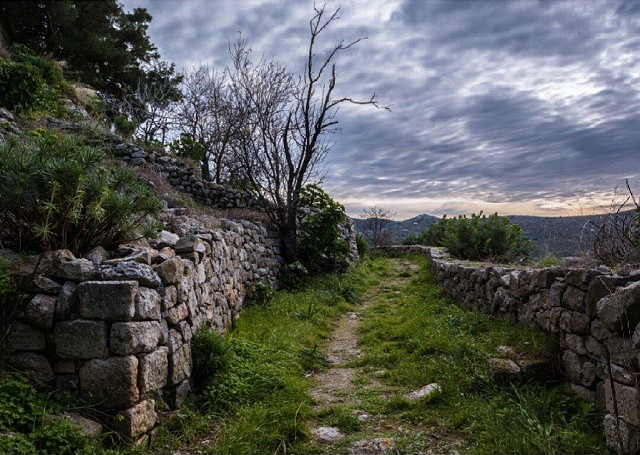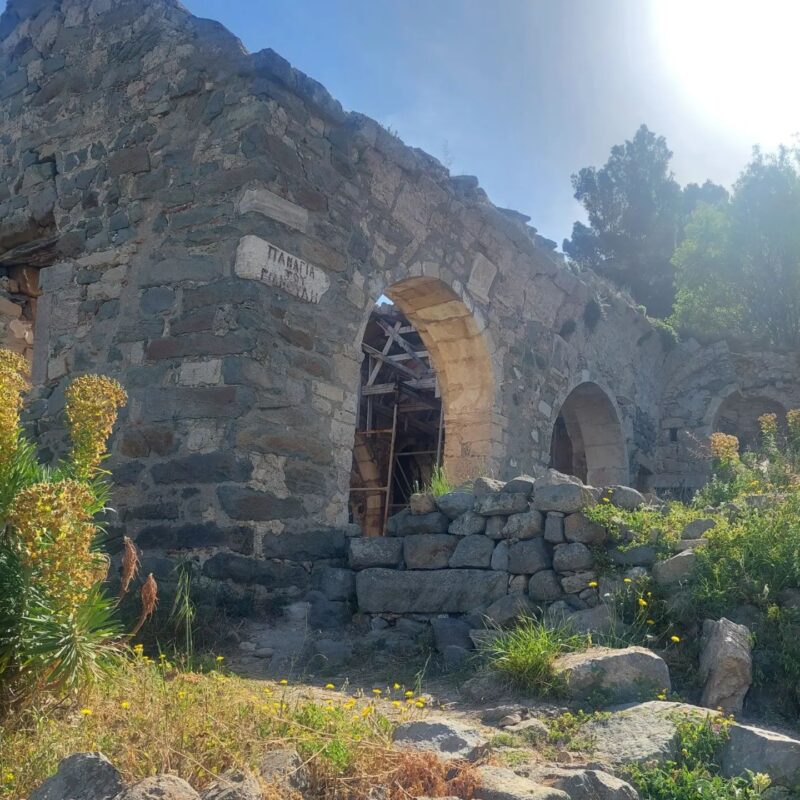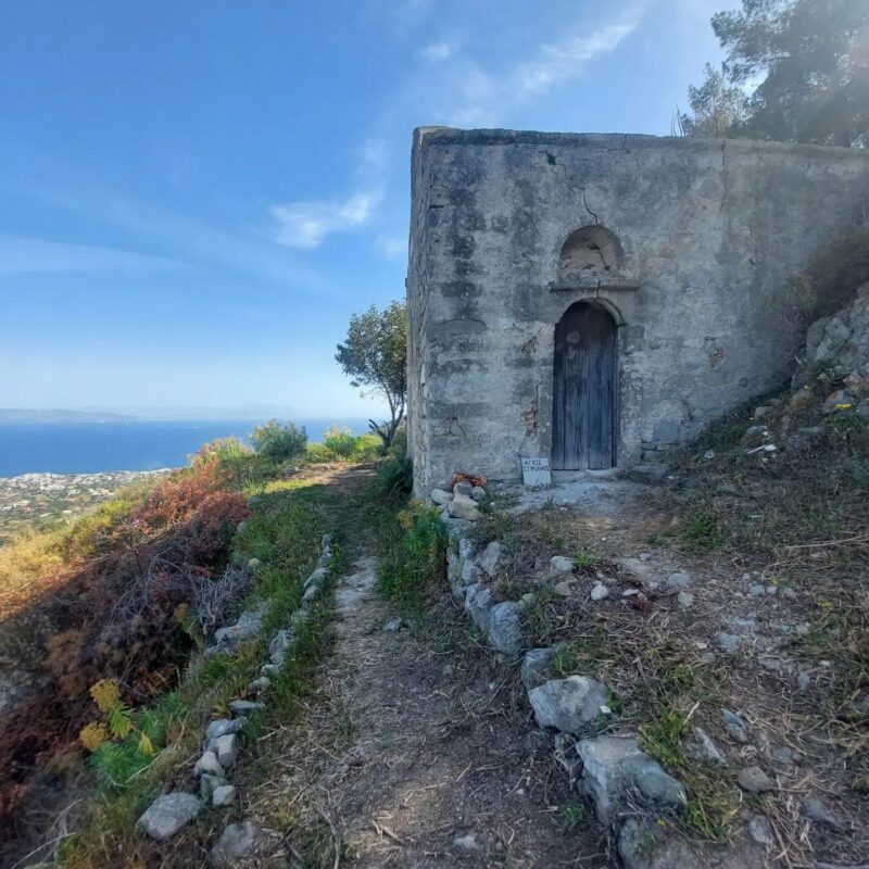 Μετά το εκκλησάκι του Άγιου Ιωάννη του Θεολόγου, παίρνουμε αριστερά την άνοδο. Περνούμε από το μικρό μοναστήρι τηs Αγίας Κυριακής και ανηφορίζουμε στην περιοχή του παλαιού κάστρου. Εκεί παρατηρούμε την εκκλησία των Αγίων Γεωργίου και Δημητρίου και τις ομβρο-δεξαμενές που επέτρεπαν την επιβίωση σε καιρούς πολιορκίας.